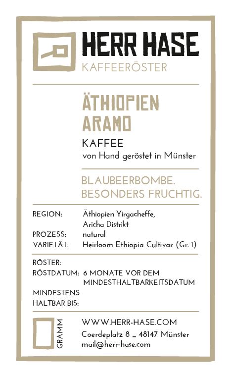 Dieser Kaffee stammt von der Kaffeeaufbereitungsstation „Aramo“ aus dem Hochland von Yirgacheffe im Bezirk Aricha. Die Kaffeekirschen werden von umliegenden Kleinbauern angebaut und nach Ankunft in der zentralen Aufbereitungsstation zunächst von Hand sortiert und anschließend aufbereitet. Eine Besonderheit des Aramo ist die Aufbereitung „natural“ bei der Qualität Grade 1 (0-3 Defekte). Grade 1 ist normalerweise nur gewaschen verfügbar. Bei dieser trockenen Aufbereitung werden die Kaffeekirschen umgehend nach dem Pflücken für ca. 15-20 Tage auf sogenannten African drying beds in der Sonne getrocknet. Dabei werden die Kirschen tagsüber ständig gewendet, um eine gleichmäßige Trocknung zu gewährleisten. Während der Trocknung der Kaffeekirschen geht ein Teil des aus dem Fruchtfleisch stammenden Fruchtzuckers auf die Kaffeebohne über, was zu einem sehr fruchtigen Geschmack führt.