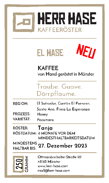 Der El Hase ist wieder ein Pacamara, honey aufbereitet aus El Salvador - dieses Mal aber nicht von der Finca La Dalia, sondern von der Finca La Esperanza.